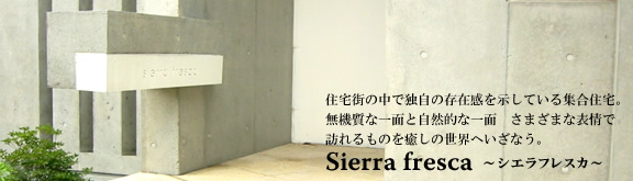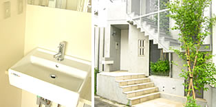 まず、全体に外と内の境界として、1mの階段の先に舞台状の踊り場が設けられています。そこからエントランスドアを抜けると、セキュリティー内外を空間に繋ぐ為の、エキスパンドメタルで囲まれた共用部に入ります。中心にヤマボウシが植え込まれていて、人工物で囲われた空間が和らいでいます。 |